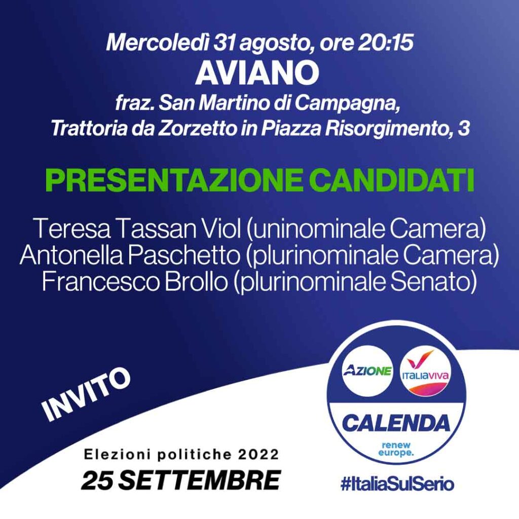 Azione e Italia Viva presentano i candidati alle elezioni per le elezioni del prossimo 25 settembre e le proposte programmatiche del Terzo Polo. ci vediamo alle 20:15 da Zorzetto in Piazza Risorgimento a San Martino di Campagna di Aviano.